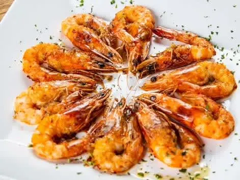10 camarões inteiros (com cabeça) levados ligeiramente ao forno regados com suave molho provençal. Tamanho do camarão nesse prato: 30g.